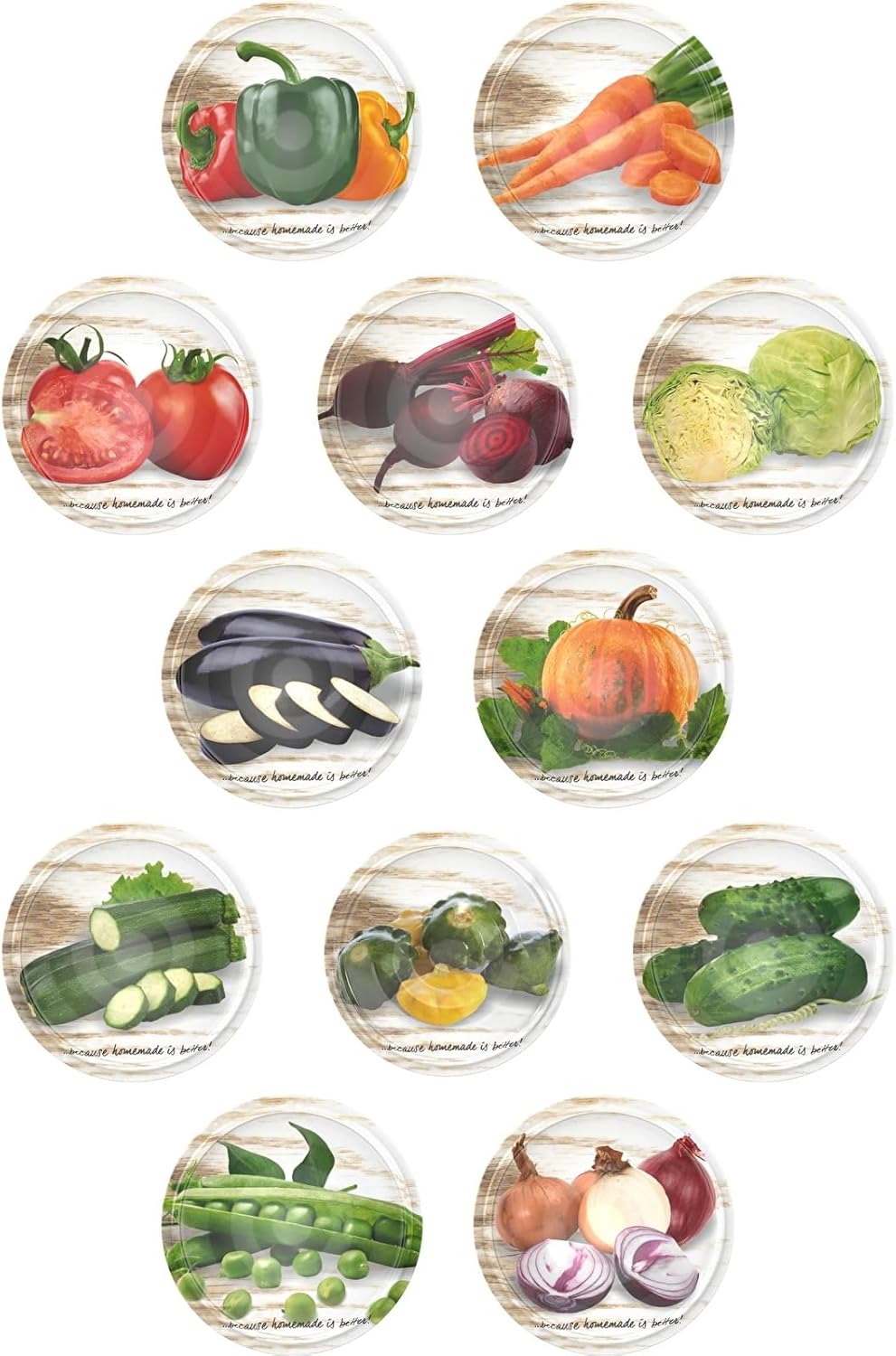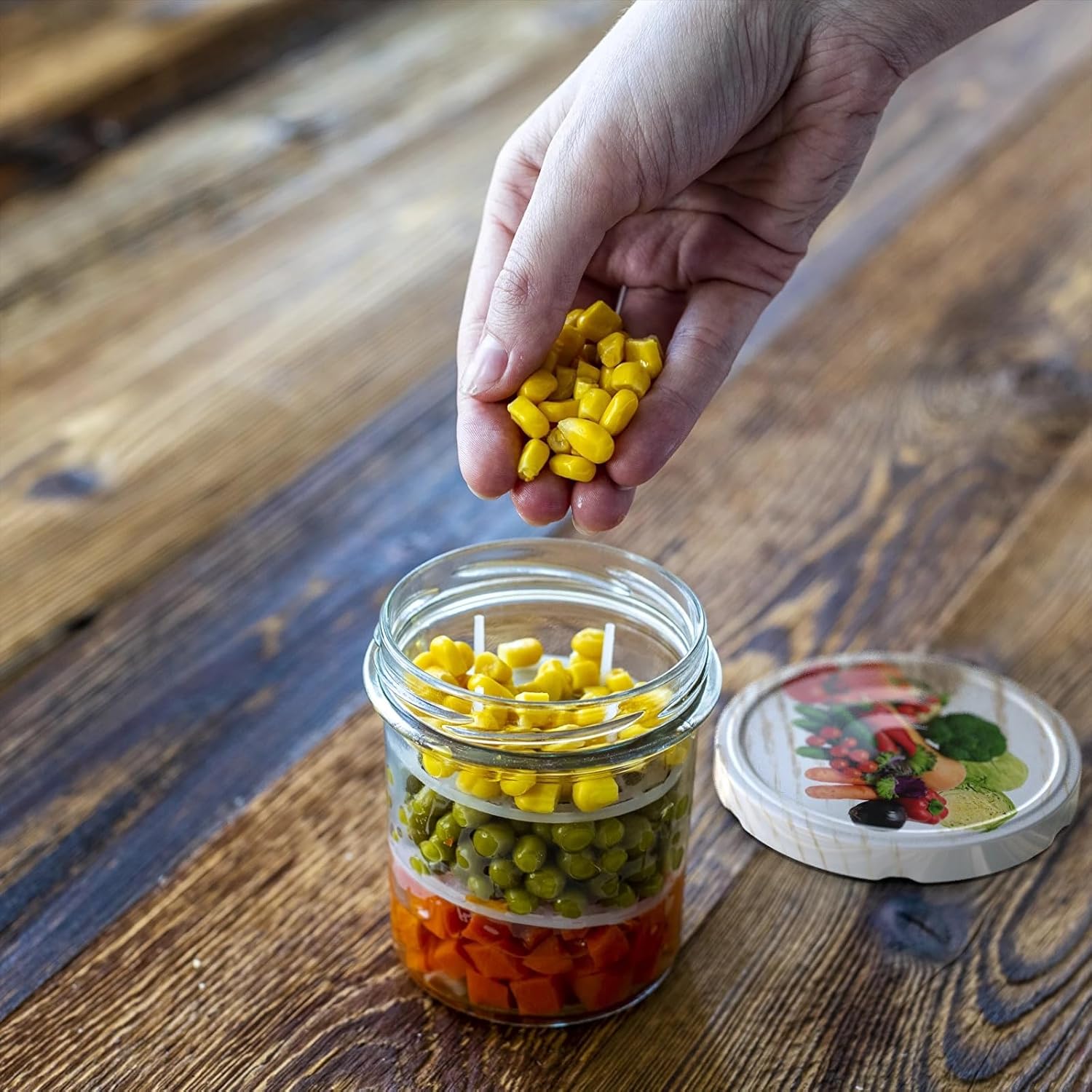 • Flexible Press-Elemente – Passgenau für Gläser mit Ø 82 mm, bei Bedarf individuell zuschneidbar für kleinere Gläser (z. B. Ø 66 mm). Die Deckel können in verschiedenen Mustern vorkommen und werden den Gläsern zufällig zugeordnet. Das Foto zeigt ein Beispielmuster, u. a. geeignet für Essigmarinaden und eingelegtes Gemüse.