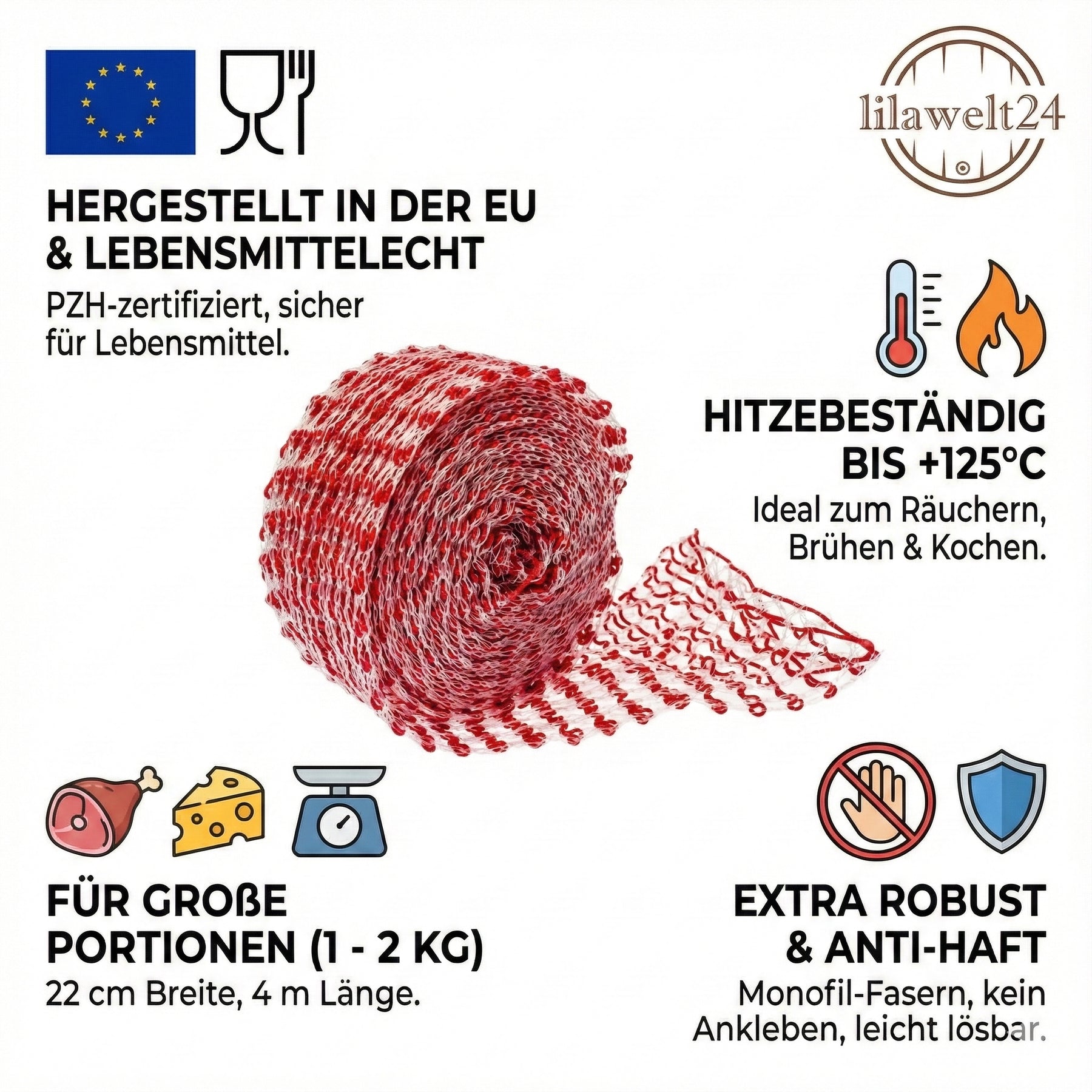 OPTIMAL FÜR RÄUCHERN & BRÜHEN: Das Netz ist für die thermische Bearbeitung bis zu 125°C ausgelegt. Es eignet sich hervorragend zum Räuchern, Brühen und Kochen von hausgemachten Fleischwaren.