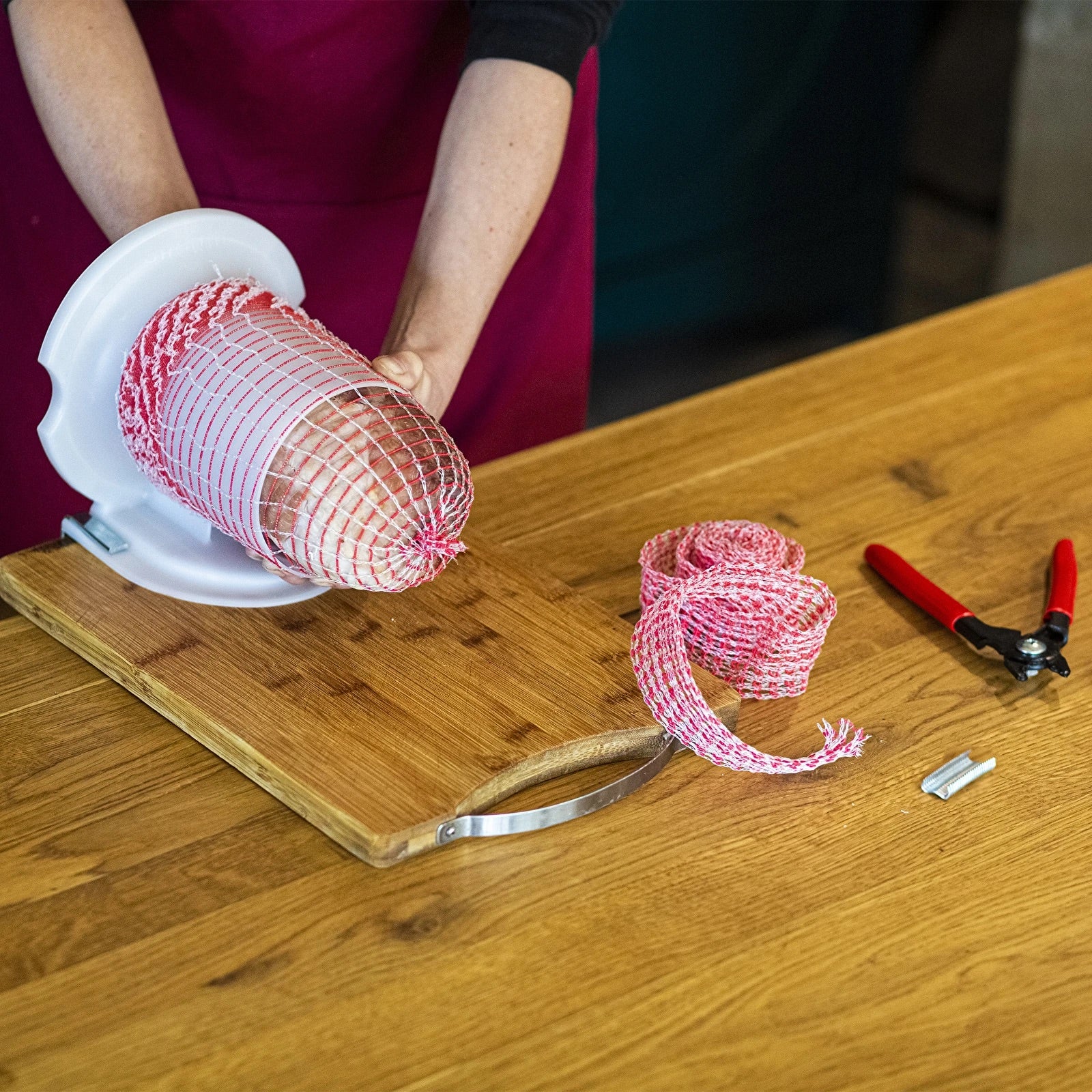 EXTRA ROBUST DURCH MONOFIL-FASERN: Dank der Einarbeitung spezieller Monofilament-Fasern ist dieses Netz extrem reißfest und elastisch, wodurch es Schinken und Fleischstücken eine perfekte, traditionelle Form verleiht.