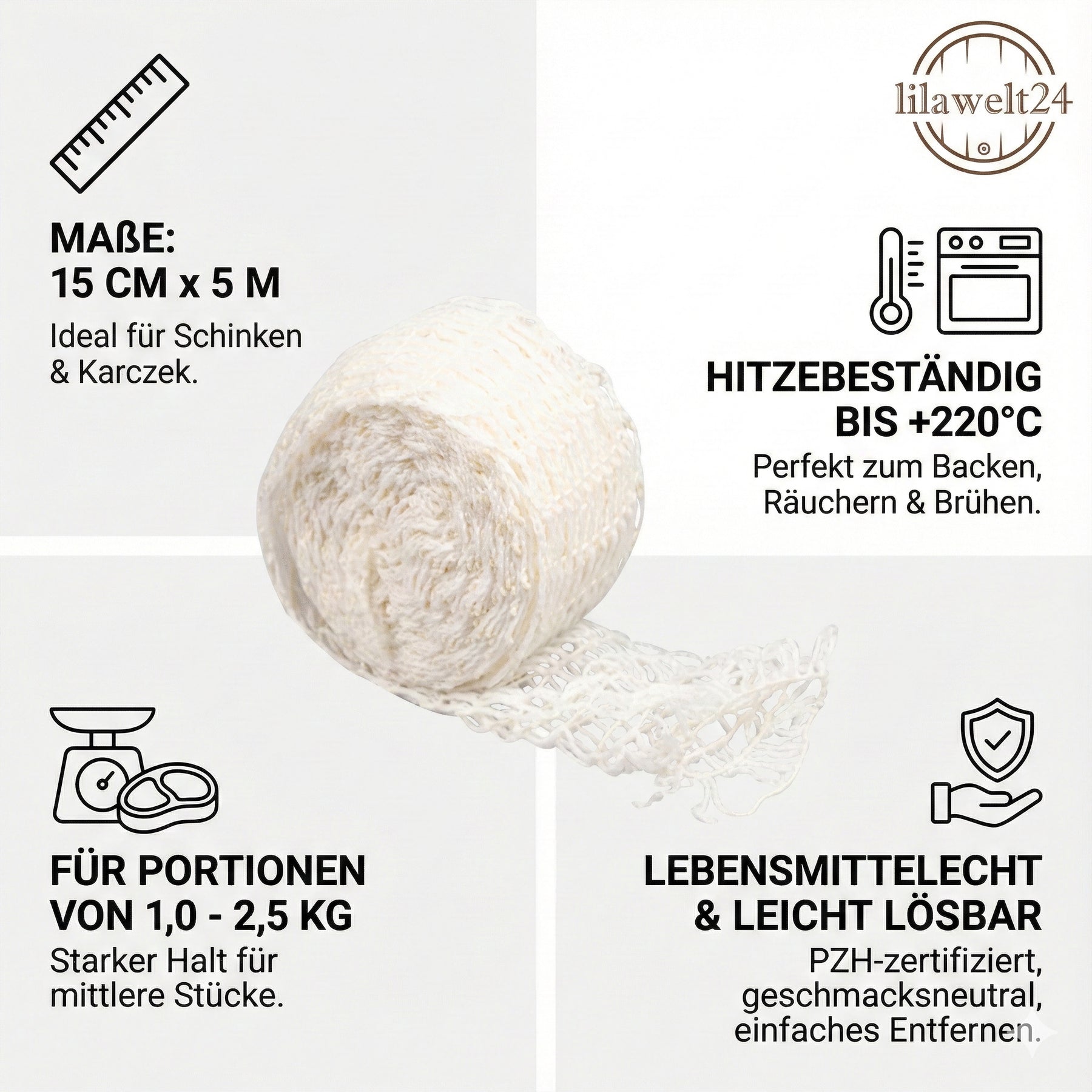 PROFI-QUALITÄT FÜR ZU HAUSE: Sorgen Sie für eine gleichmäßige Form und optimale Kompression Ihres Fleisches. Mit dem lilawelt24 Schinkennetz erzielen Sie Ergebnisse wie vom Profi-Metzger – saftig, formstabil und optisch ansprechend.