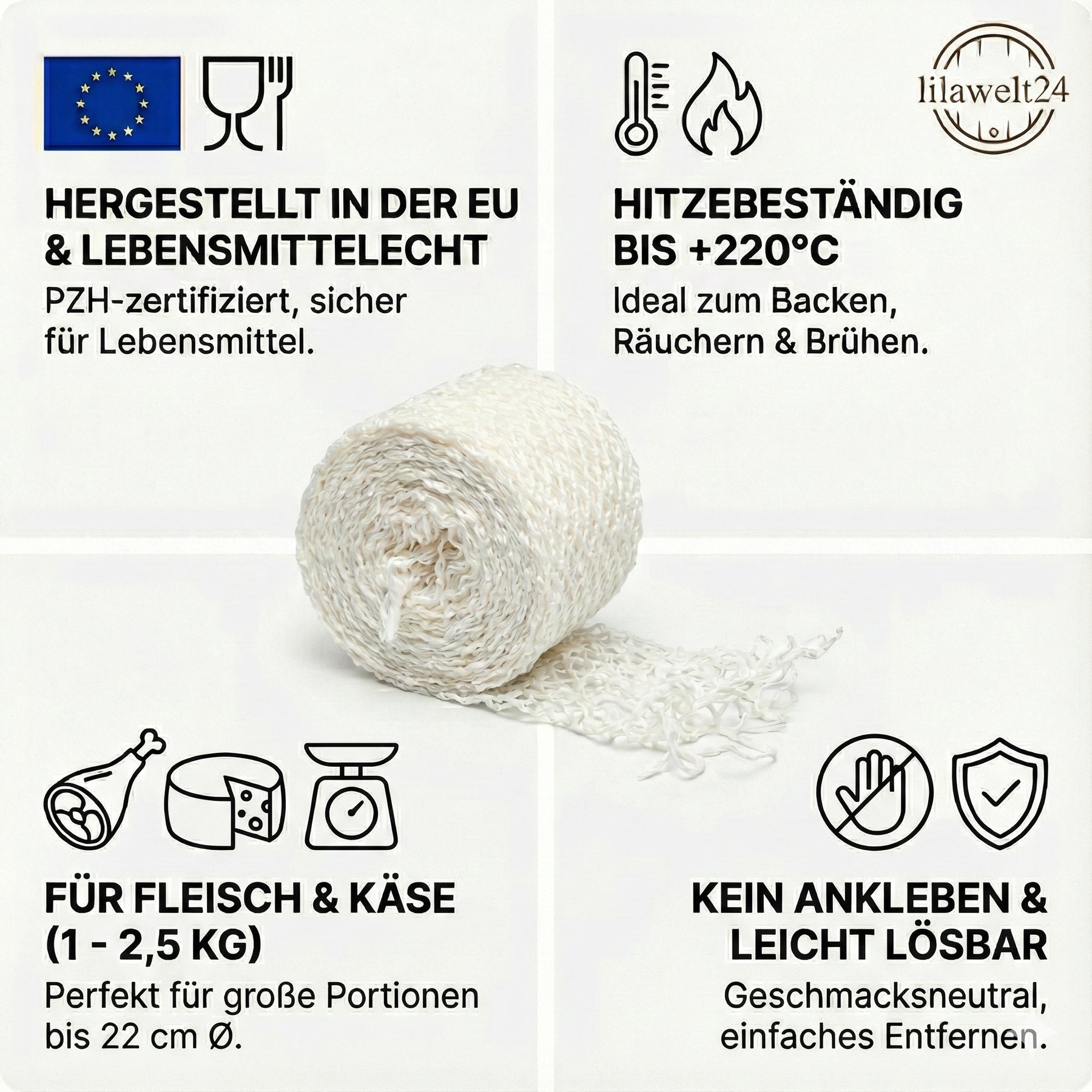 Das solide, professionelle Räuchernetz lässt sich leicht von hausgemachten Erzeugnissen lösen. Dank ihm erlangen Ihre hausgemachten Erzeugnisse ein außergewöhnlich appetitliches Aussehen. Die hochqualitativen Materialen, aus denen das Netz gefertigt ist, machen es sehr elastisch – in ihm finden Produkte von einem Durchmesser von bis zu 22 cm und einem Gewicht von 1 bis 2,5 kg Platz. Das Räuchernetz kann bei der Wärmebehandlung bei einer maximalen Temperatur von bis zu 220°C sicher verwendet werden.